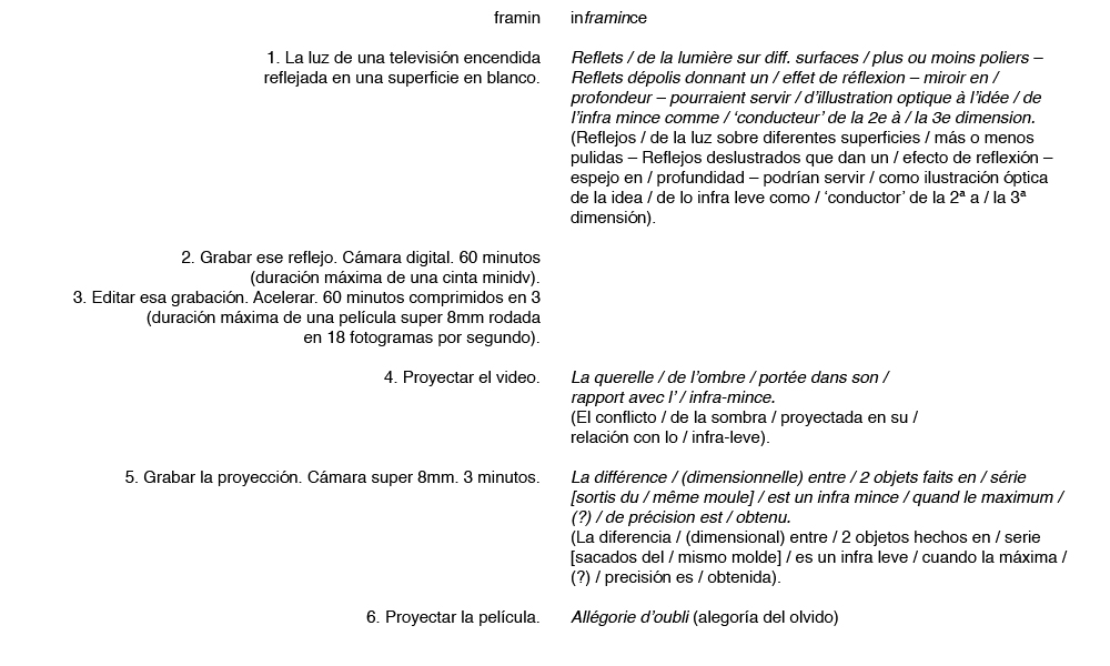 En Framin se ha trabajado a partir de algunos de los puntos referidos por Duchamp en la definición del inframince: una especie de resquicio de la imagen, del gesto, algo que queda de otra cosa. A través de una operación similar a la empleada por el artista en sus sentencias y en paralelo a ellas, se ha establecido una secuencia de acciones resultando en una imagen visible final del proceso (el film).