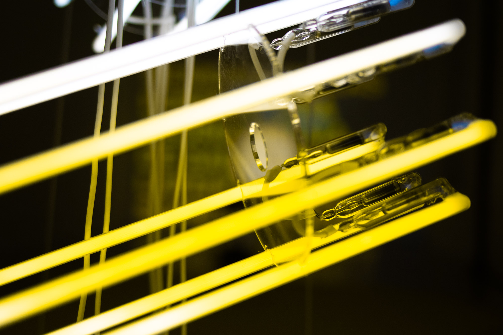 Las primeras obras que nos encontramos,Timelines (2020), suspendidas en el aire, son tres piezas de neón de distintos tamaños a diferentes alturas. Hacen referencia a líneas temporales (o líneas de mundo, en el espacio-tiempo y vocabulario de Minkowski): rectas, pero a la vez cortadas, limitadas; en paralelo, pero puestas en circularidad. Tiempo lineal y tiempo circular. Ambos presentes en nuestra percepción del tiempo. Nuestras vidas parecen que discurren como una línea (que no recta), pero en días y noches que se repiten, en eventos cíclicos, en muchos y muchos ciclos.