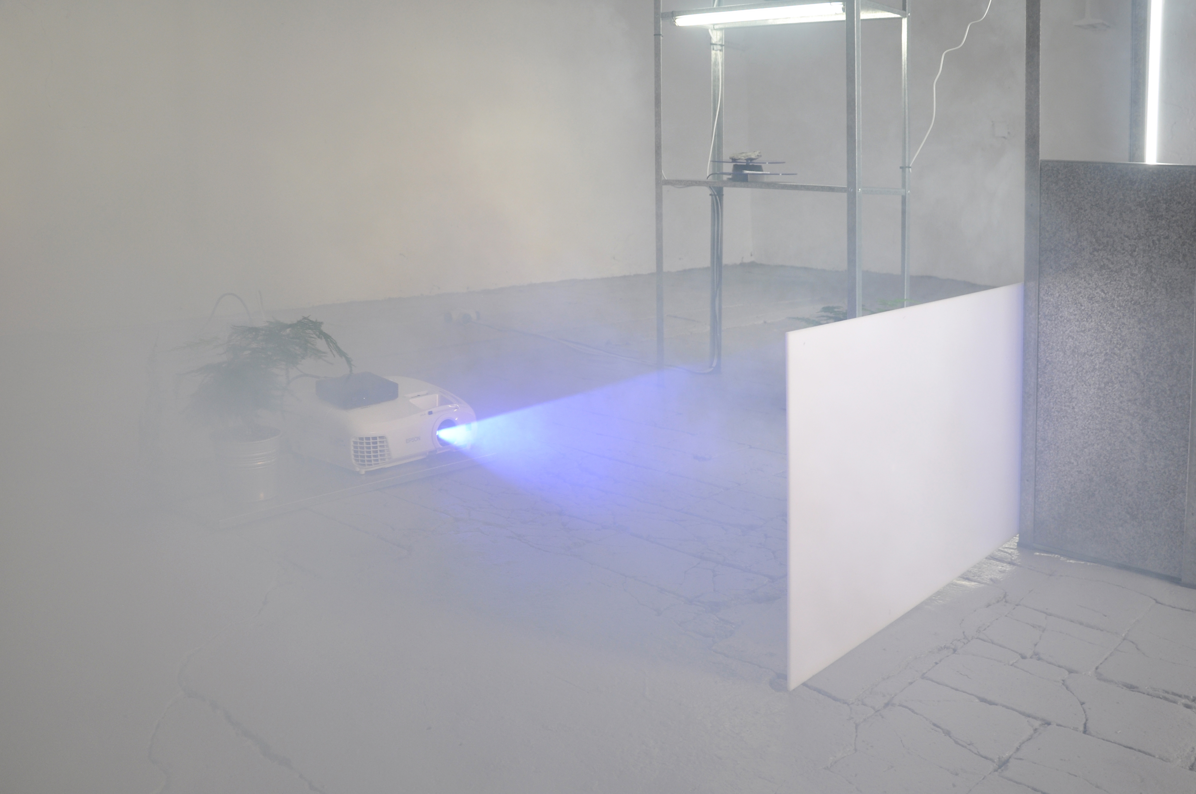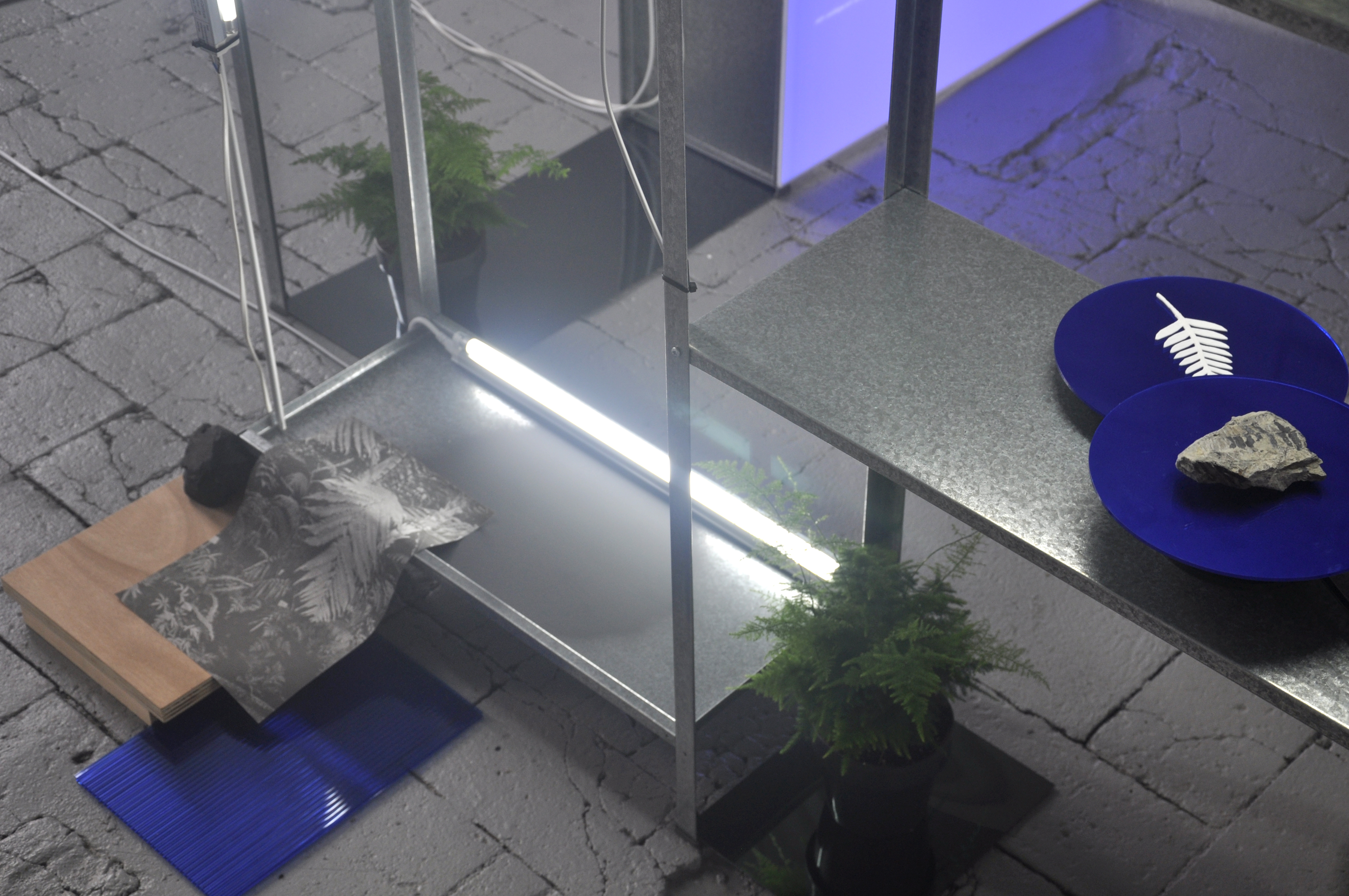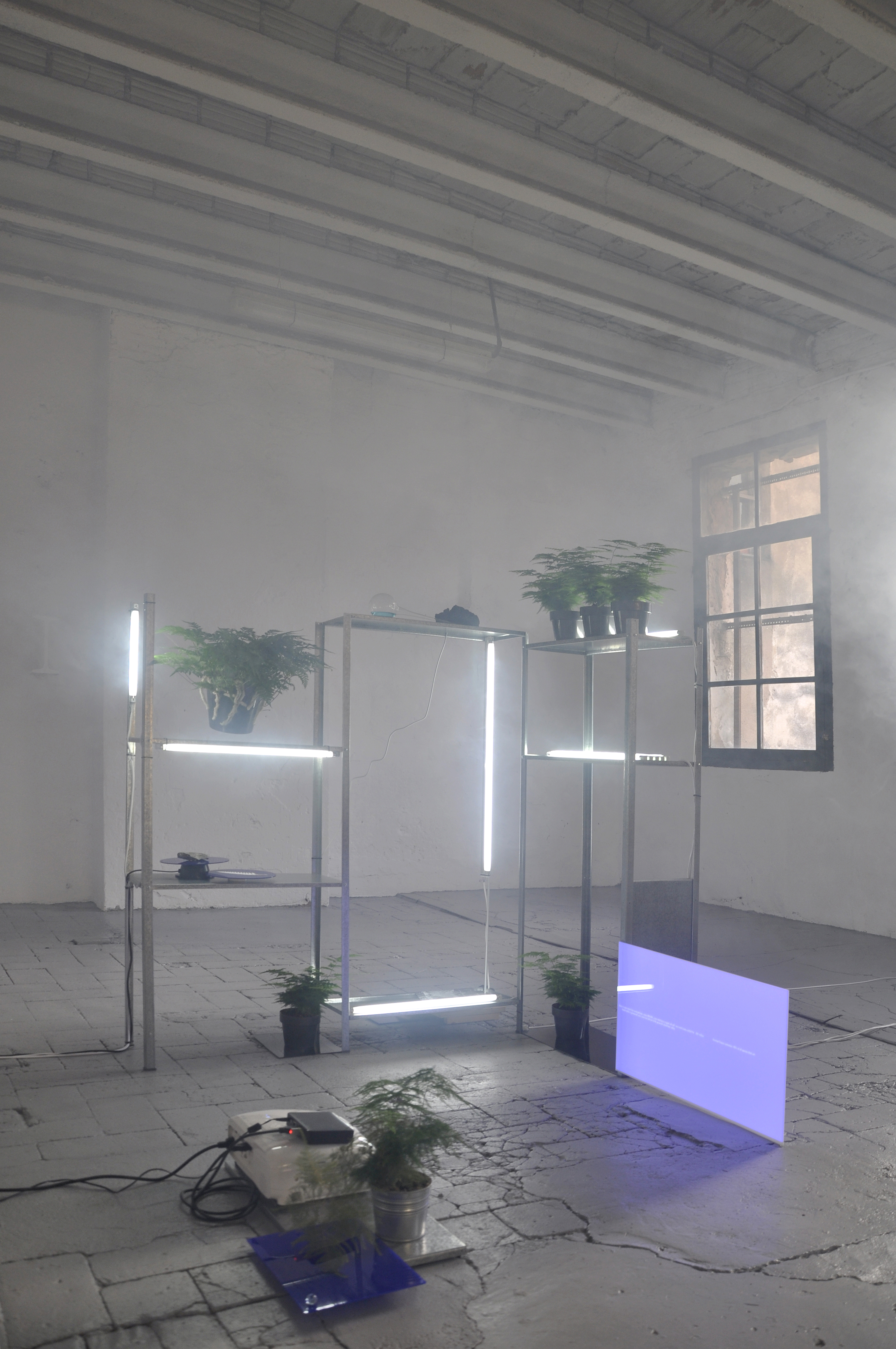 Instalación con estantería metálica, plantas, papel, piedra, tinta, niebla, metacrilato, motor, fósil, impresión 3D, cristal, líquido de limpieza, carbón, proyector, tubos fluorescentes, cables
